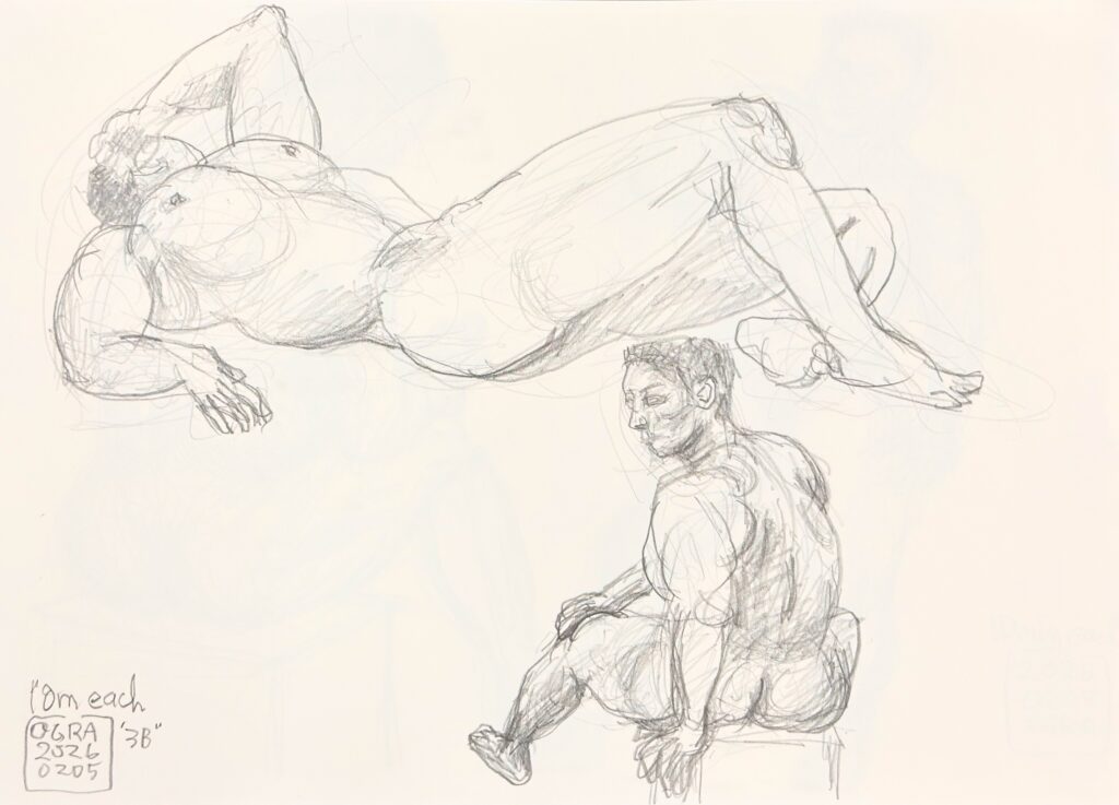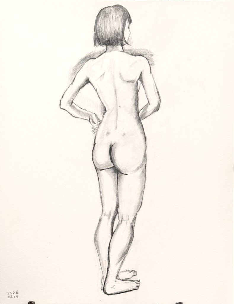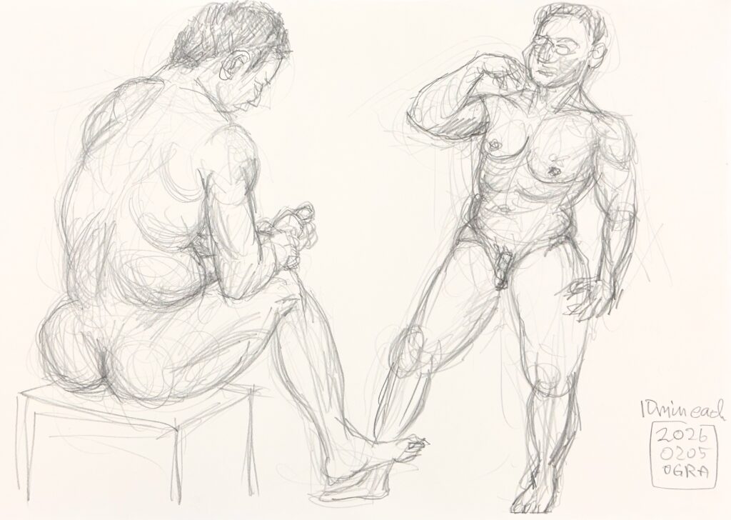 前半は5ポーズのクロッキーで手を慣らし、後半は固定ポーズ(20分×5回)でじっくりと対象を捉えます。